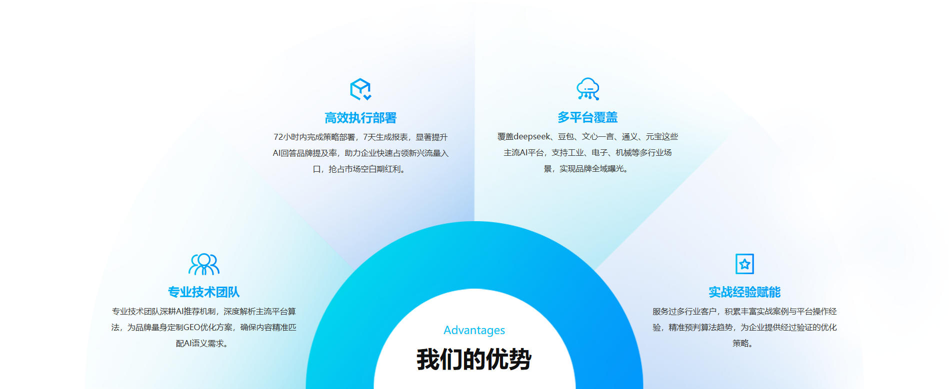 72小时内完成策略部署,7天生成报表,显著提升AI回答品牌提及率,助力企业快速占领新兴流量入口,抢占市场空白期红利。